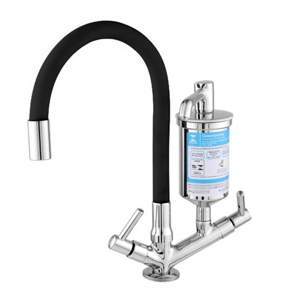 Torneira em Metal com o Filtro em ABS. Bitola: 1/2 com redução de 3/4. Mecanismo de vedação: 1/4volta-M18 Canopla: inox Arejador: fixo Bica: Flexível Local de instalação: Cozinha Mesa/Bancada Peso aproximado:600gr Cor: Preta