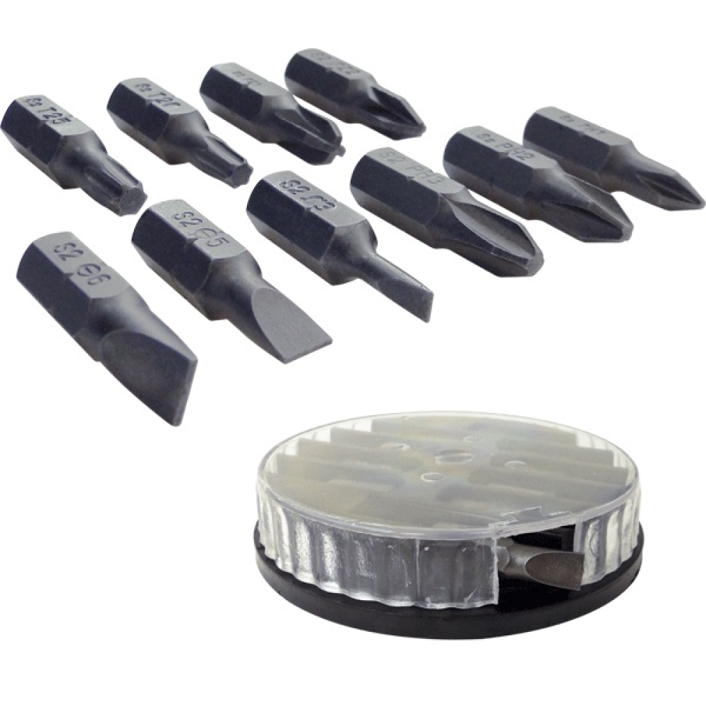 Jogo com estojo plástico com bits fenda, phillips, torx e pozidrive.
