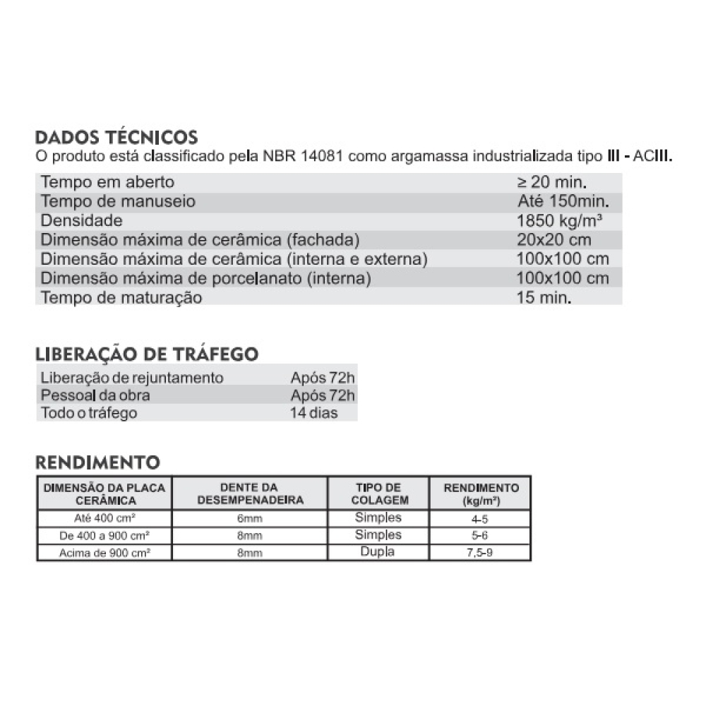 Características e Benefícios • As peças cerâmicas a serem aplicadas devem estar secas, limpas, sem poeiras, películas ou resíduos que impeçam a aderência da argamassa. • Observar a necessidade de juntas de movimentação. • Cordões de argamassa ressecados deverão ser removidos e não poderão ser reutilizados, pois a reação química já se iniciou perdendo as propriedades de aderência. • Somente após 72 horas da aplicação o pessoal da obra poderá transitar sobre o piso. • Consulte a embalagem, ou ficha técnica para maiores informações. • Use sempre equipamentos de segurança e proteção individual.