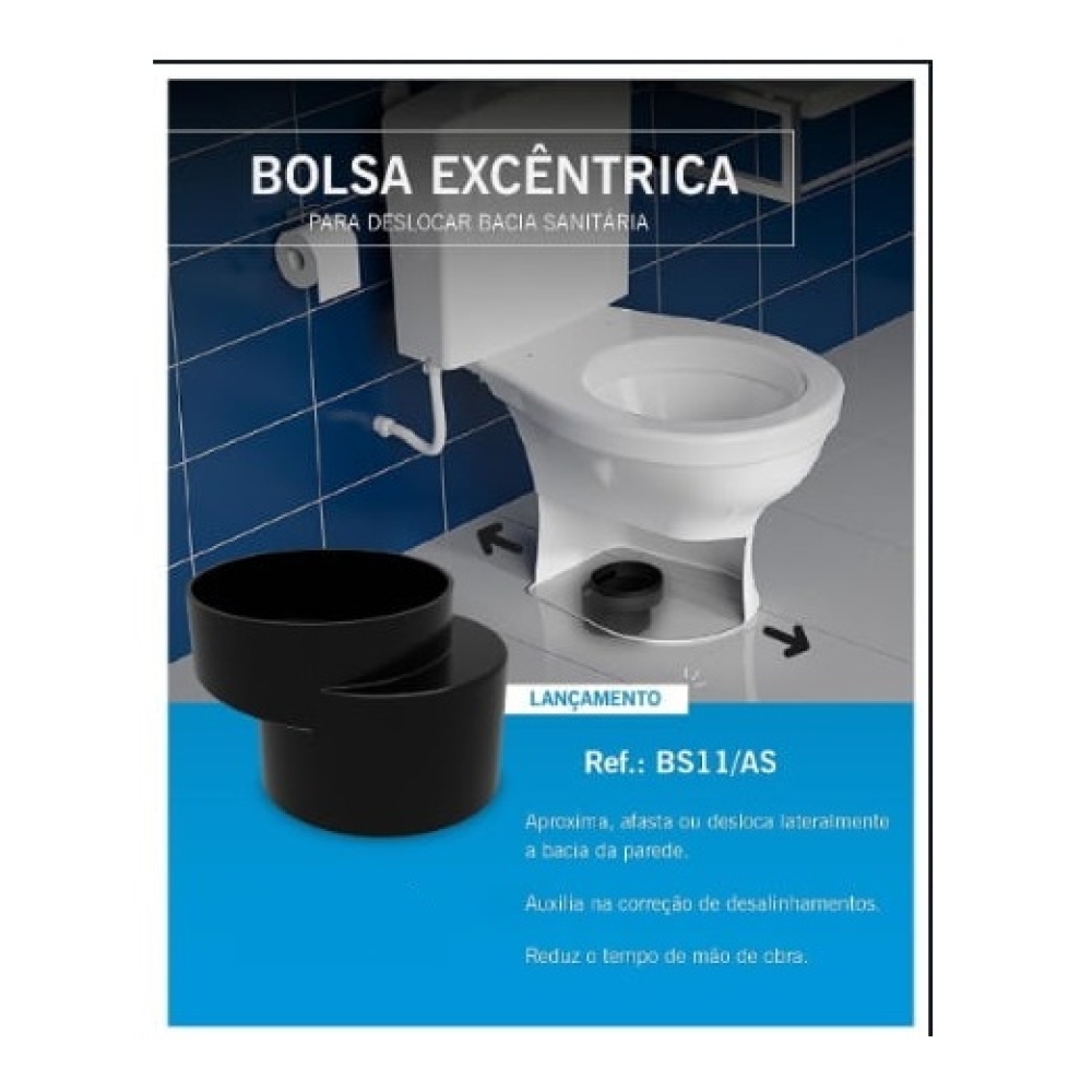 A bolsa excêntrica da Astra foi desenvolvida para alterar o ponto de instalação da bacia sanitária, podendo deslocar a instalação em até 27mm. Ela é ideal em casos de instalações feitas com medidas incorretas e precisam de ajuste sem fazer grandes mudanças na tubulação de esgoto. Pode ser utilizada também no momento de troca de uma bacia com válvula de descarga para caixa acoplada, porém é importante verificar se o deslocamento proporcionado pela bolsa excêntrica Astra será o suficiente.