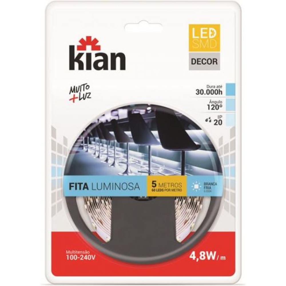 Rolo: 5M Marca: Kian Tensão(Vdc): 12V Potência: 4,8W/m Quantidade de LEDs: 60 LEDs SMD 3528/m Grau de potência: IP20 Temperatura de cor: Branco Frio 6.000K