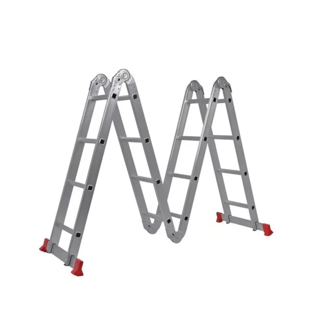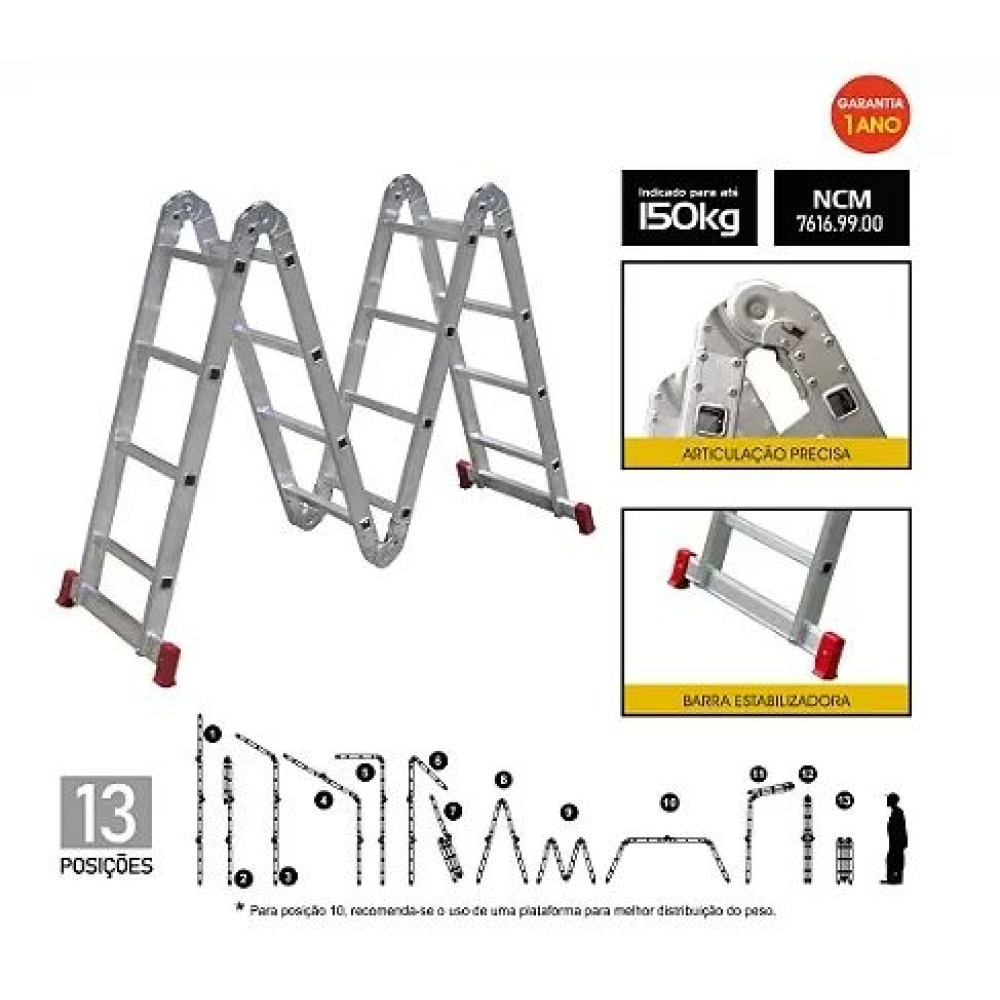 Escada Multifunção Articulada 4 x 4 (4 sessões de 04 degraus), 16 degraus, em alumínio, leve e fácil de transportar, pode ser utilizada estendida, como andaime, na posição de pintor e em outras 10 posições. Articulações precisas com travamento automático, barras estabilizadoras para melhor fixação e degraus antiderrapantes com maior área de contato.