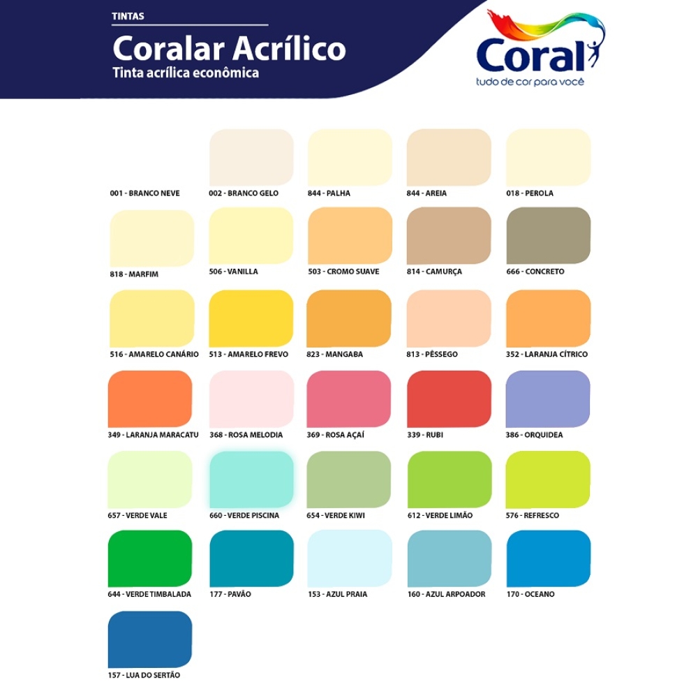 A coralar agora está com uma nova embalagem e nova fórmula. Com maior rendimento e cobertura em relação à fórmula anterior e de fácil aplicação, rápida secagem, mínimo respingamento e oferece bom acabamento e ação antimofo. Dísponível em 31 cores prontas. Uma lata de 18 Litros rende até 320m² por demão.