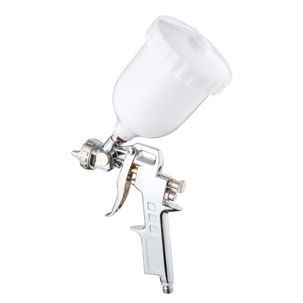 Características Uso Profissional Tipo Gravidade Em Alumínio Copo em ABS Bico 1,5mm Controle de fluído ajustável Entrada Universal – 1/4" NPT Leque Spray: 180-250mm Pressão para operação: 3,5 até 5,0bar Simples limpeza e manutenção