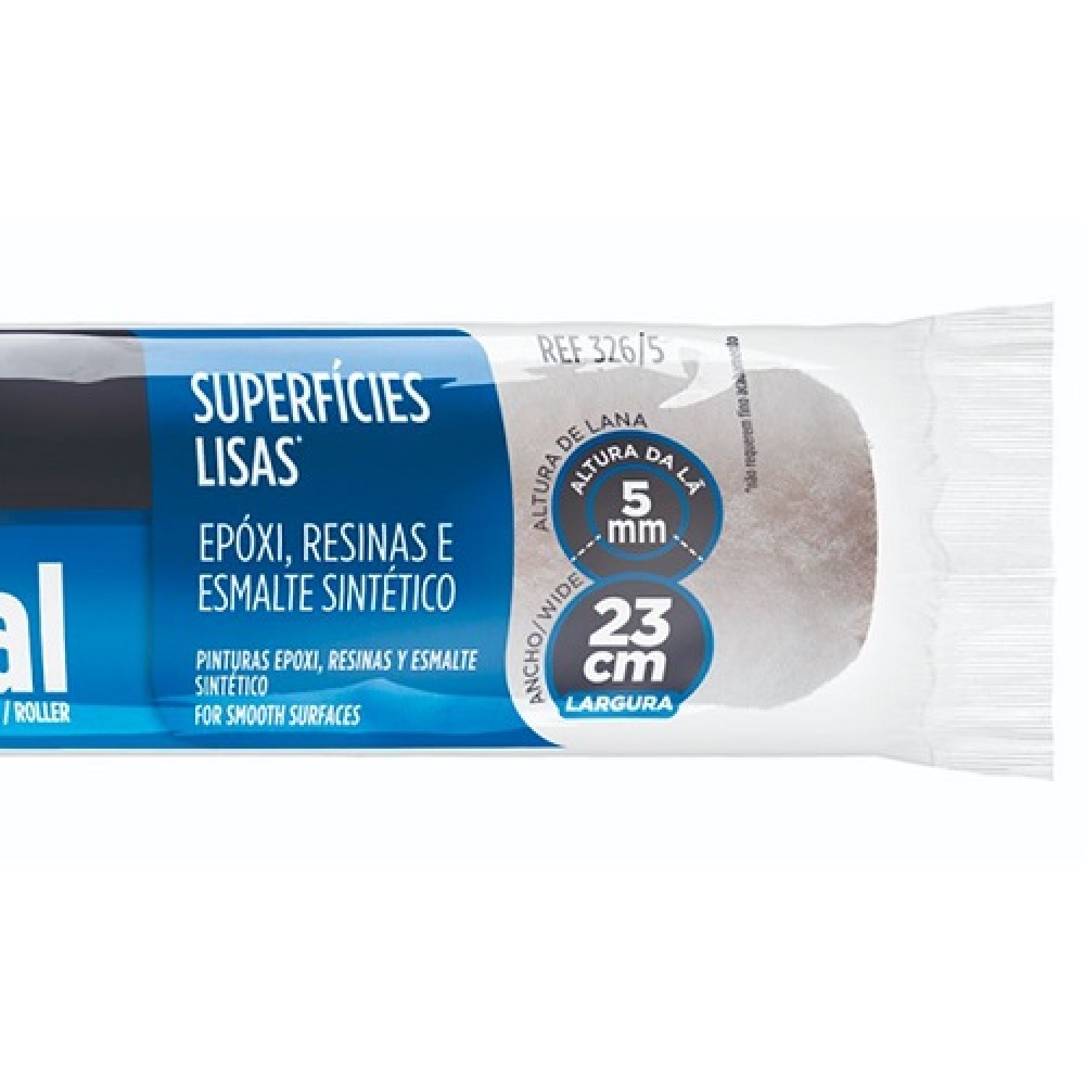 Rolo de 23cm de lã de poliéster com 5mm de altura. Especial para resinas, esmaltes e epóxi sobre grandes superfícies, onde não se requer fino acabamento. Resistente a solventes.