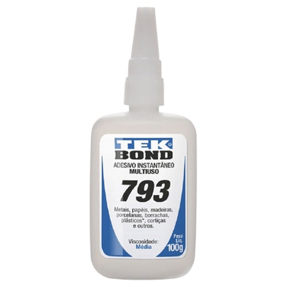 Tipos de Adesivos: Adesivo Local Indicado: Para uso geral Local(is) Indicado(s): Armário, Condulete, Mesa e Móveis Tipo de Colagem: Fixação Uso Indicado: Multiuso Produto: Adesivo Contém na Embalagem: 100G Marca: Tek Bond Linha: 793 Cor: Incolor Tonalidade: Incolor Tempo de Secagem: 24 h Observações sobre a Secagem: Cura total de 24 horas Modo de Usar: Para obter um resultado satisfatório, as superfícies devem estar limpas, isentas de óleo e sujeira. Deve-se aplicar uma camada fina de adesivo em apenas 1(um) dos substratos a serem colados, pois o excesso prejudica o bom desempenho da colagem. Após a aplicação do adesivo, é preciso manter as peças pressionadas por aproximadamente 20 segundos, quando a cura inicial estará concluída e a peça poderá ser manuseada com segurança. A cura total ocorrerá em 24 horas. Este adesivo é indicado para folgas de até 0,10mm.