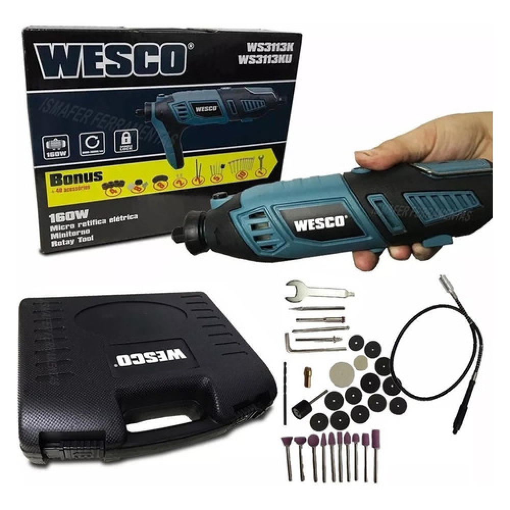 Microrretífica elétrica é ideal para trabalhos que exijam precisão e perfeição. É indicada para furar, fresar, esmerilar, polir, limpar, esculpir e gravar em vários tipos de materiais. Possui velocidade variável, que pode ser facilmente controlada pelo usuário, conta eixo flexível com trava do eixo para troca de disco. Troca externa de escova de carvão.
