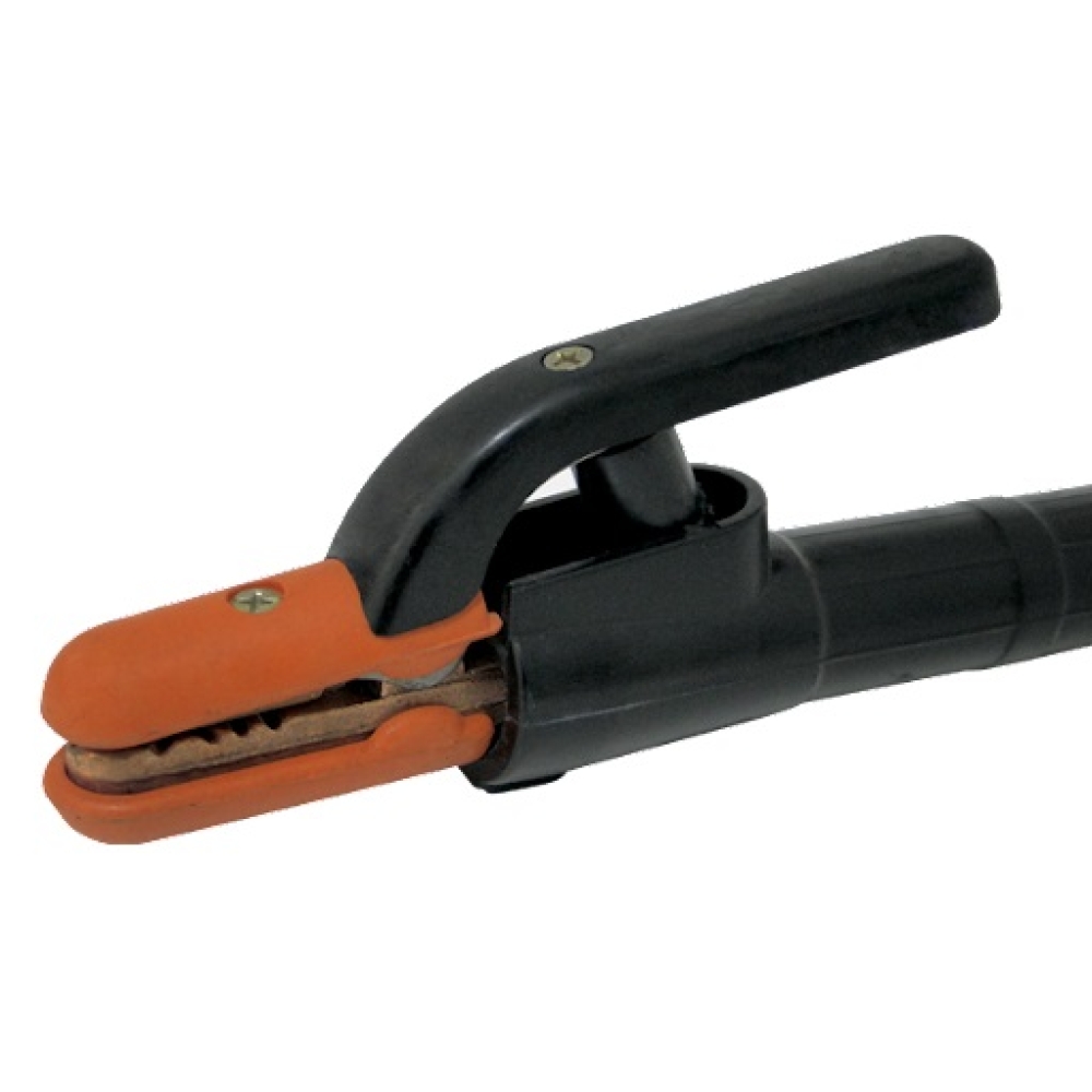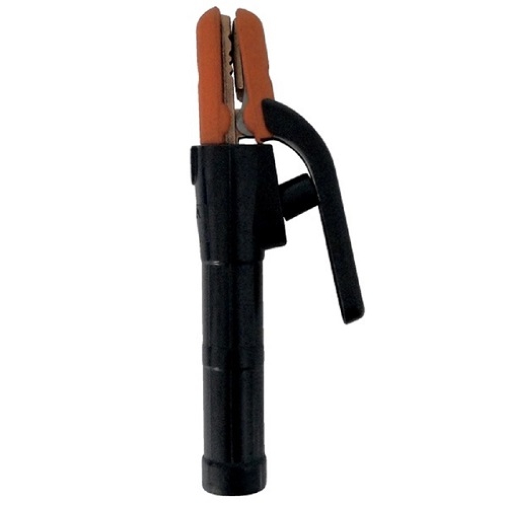 O porta-eletrodo serve para a fixação e energização do eletrodo. É fundamental a correta fixação e boa isolação dos cabos para que os riscos de choque sejam minimizados.