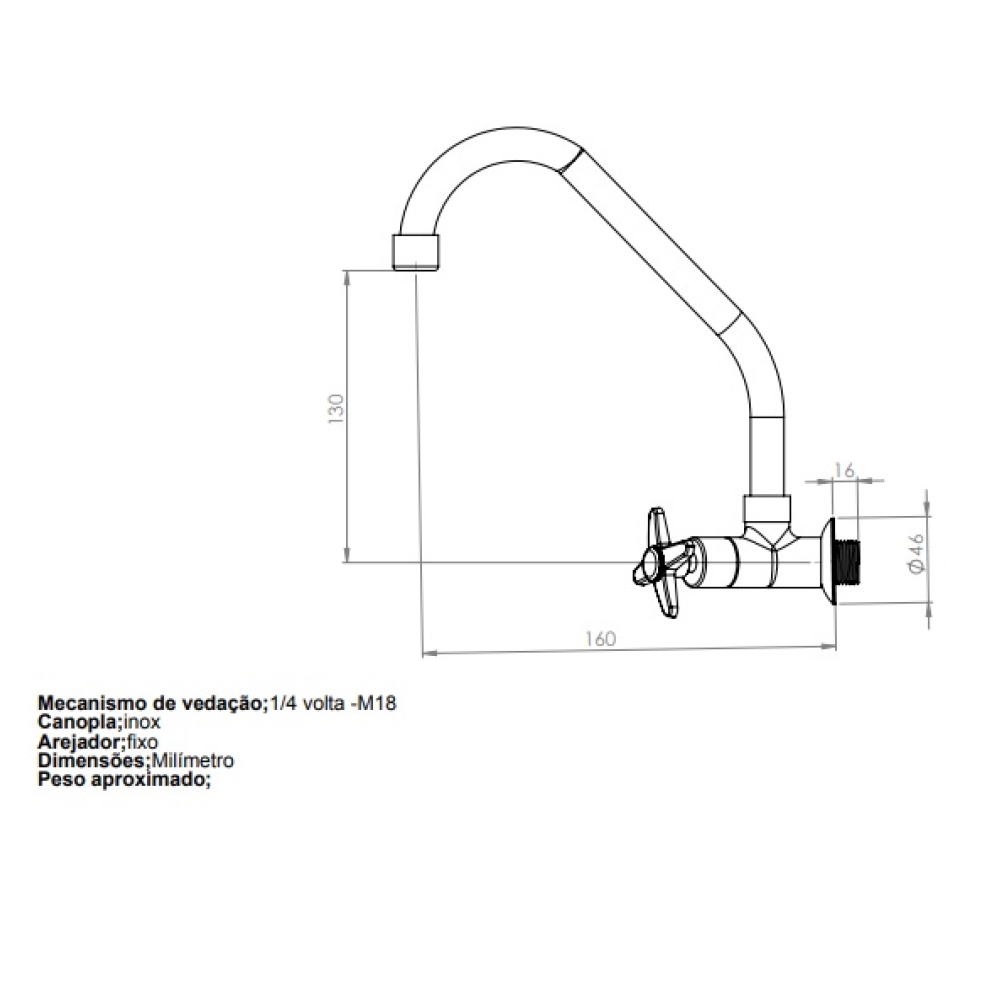 Torneira em Metal. Bitola: 1/2 com redução de 3/4. Mecanismo de vedação: 1/4 Volta -M18 Canopla: inox Arejador: Articulado Bica: Móvel Local de instalação: Parede Cozinha Peso aproximado:310gr