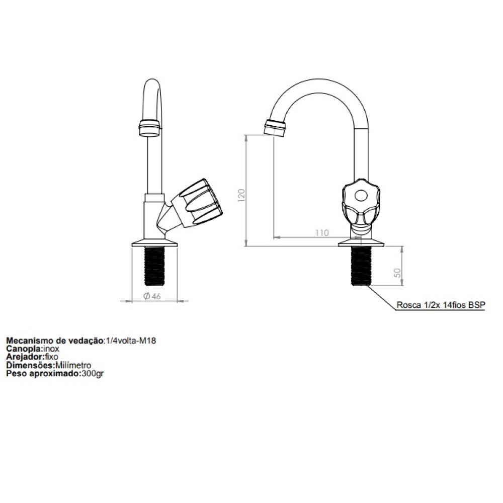 Torneira em Metal. Bitola: 1/2 com redução de 3/4. Mecanismo de vedação: 1/4volta-M18 Canopla: inox Arejador: Fixo Bica: Móvel Local de instalação: Mesa lavatório de banheiro Peso aproximado:300gr