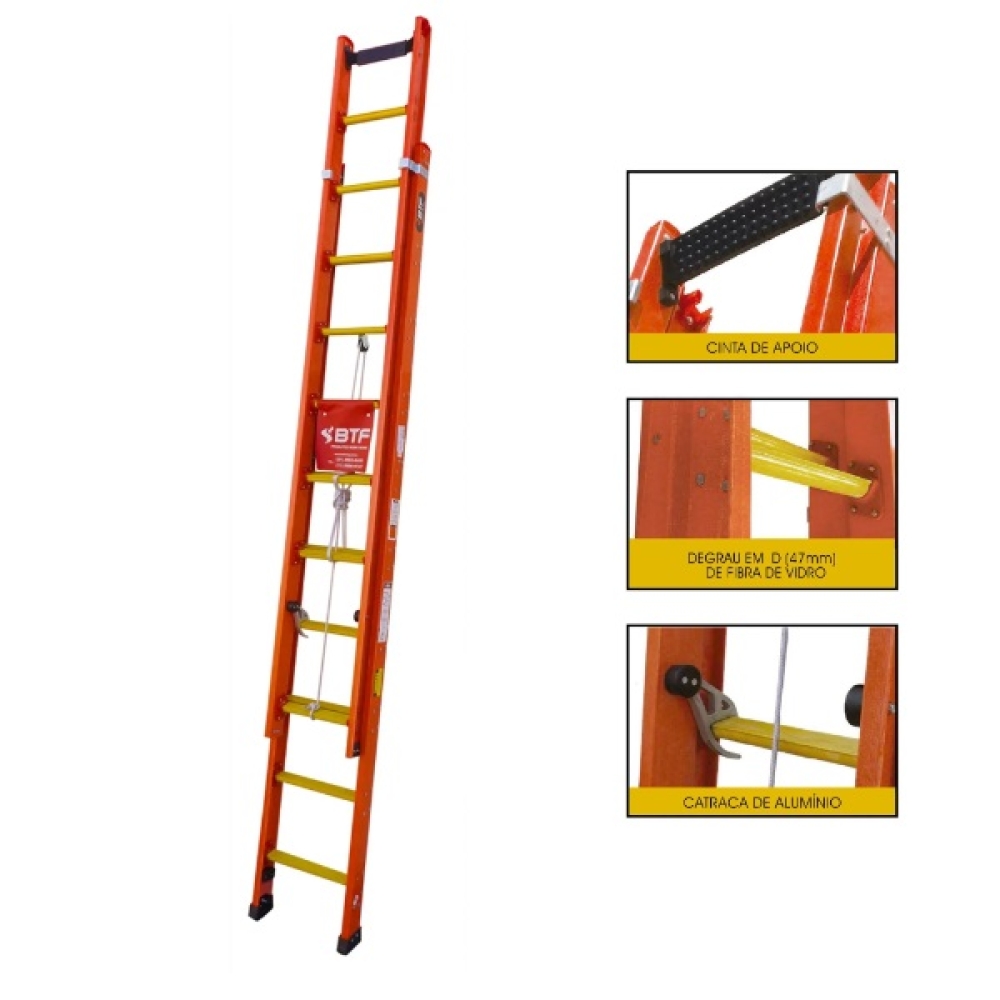 Escada 19 degraus - Linha Extensível Profissional Robusta, alta qualidade, que visa acima de tudo segurança e praticidade. Possui sistema com catraca de alumínio, cinta de apoio, degrau em D(47 MM) de fibra de vidro e sapatas em borracha (antiderrapantes). O produto não conduz eletricidade! Indicada para uso diário, trabalhos de pintura e manutenção em geral.