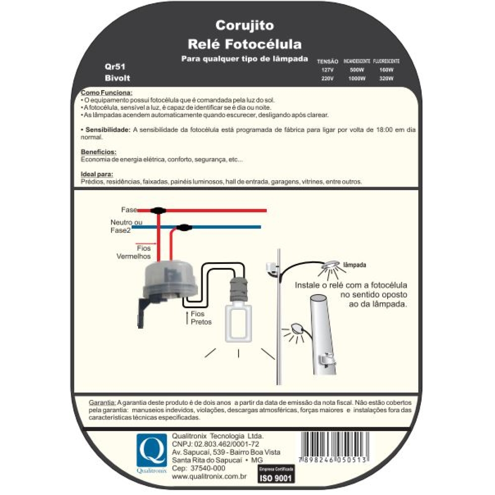 ESPECIFICAÇÕES - Modelo QR51. - Fabricante : Qualitronix. - Tensão : Bivolt 127 / 220 volts. - Suporta : 127v - 500 Watts / 220v - 1000 Watts Lampadas Incandescente - Suporta : 127V - 160 Watts / 220v - 320 Watts Lampada Fluorescente - Fixação : Através de suporte tipo "L" - Horário de acendimento : Próximo 18hs em dias normais de luminosidade. - Horário de desligamento : Próximo das 6hs em dias normais de luminosidade. - Dimensões embalagem: 6 cm altura / 12 cm de largura / 17 cm de comprimento. - Peso: 70 gramas - Garantia : 2 Anos