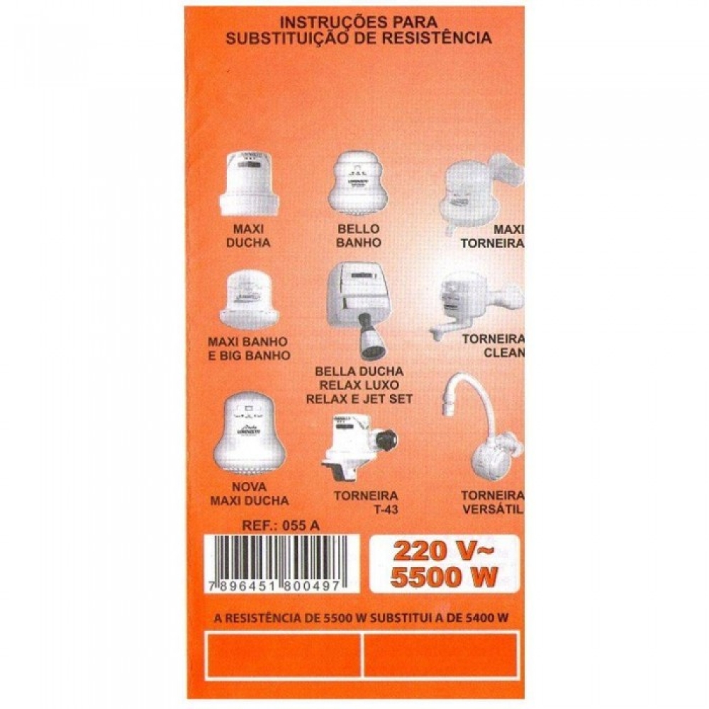 Potência: 5500W Voltagem: 220V Fácil instalação, basta abrir a ducha e substituir. Código Lorenzetti: 055-A Compatível com os seguintes produtos: Maxi Ducha, Maxi Banho, Big Banho, Bello Banho, Ducha Relax, Jet Set 3 e Torneira Elétrica Versatil. 220V.