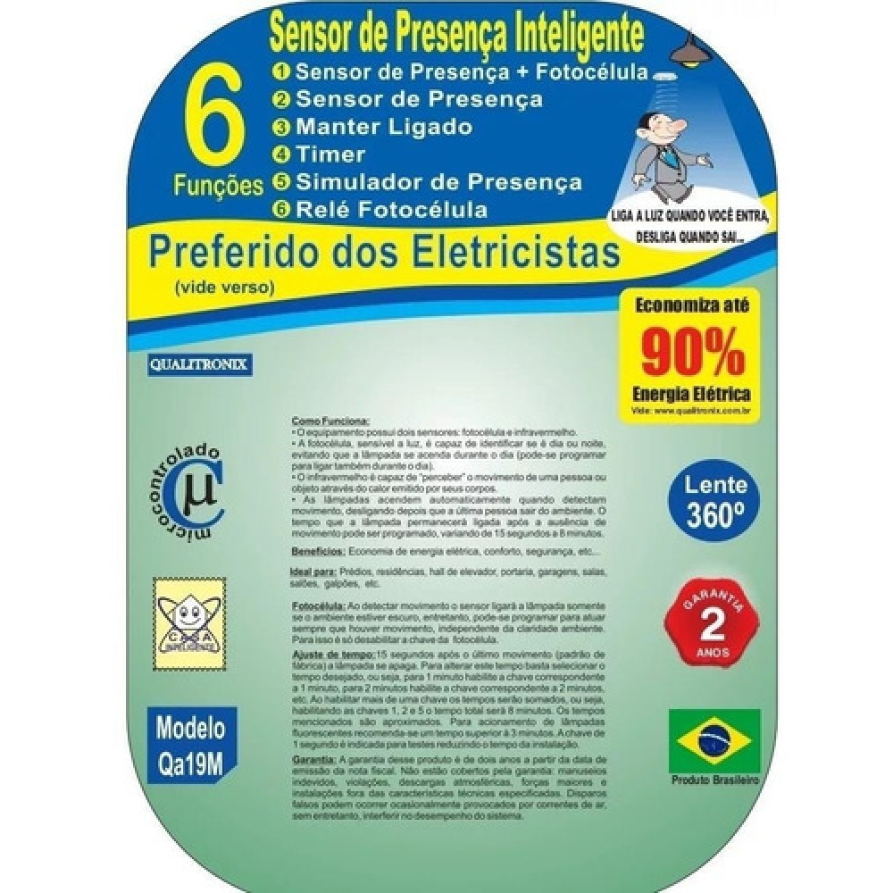 Modelo QA19M. Fabricante: Qualitronix. Tensão: Bivolt 127 / 220 volts. Funções: Timer, Relé fotoelétrico e simulador de presença. Suporta: 500 Watts em 127 volts e 1000 Watts em 220 volts lâmpada incandescente. 160 Watts em 127 volts e 3200 Watts em 220 volts lâmpada fluorescente. Fixação: Teto através de presilhas. Ângulo de abrangência: 360 graus. Regulagem de tempo: 15 segundos a 08 minutos. Alcance médio: 8 metros. Dimensões embalagem: 5 cm altura / 12 cm de largura / 18 cm de comprimento. Peso: 90 gramas Conteúdo da embalagem: 01 sensor de presença, e 01 manual de instruções e instalação.