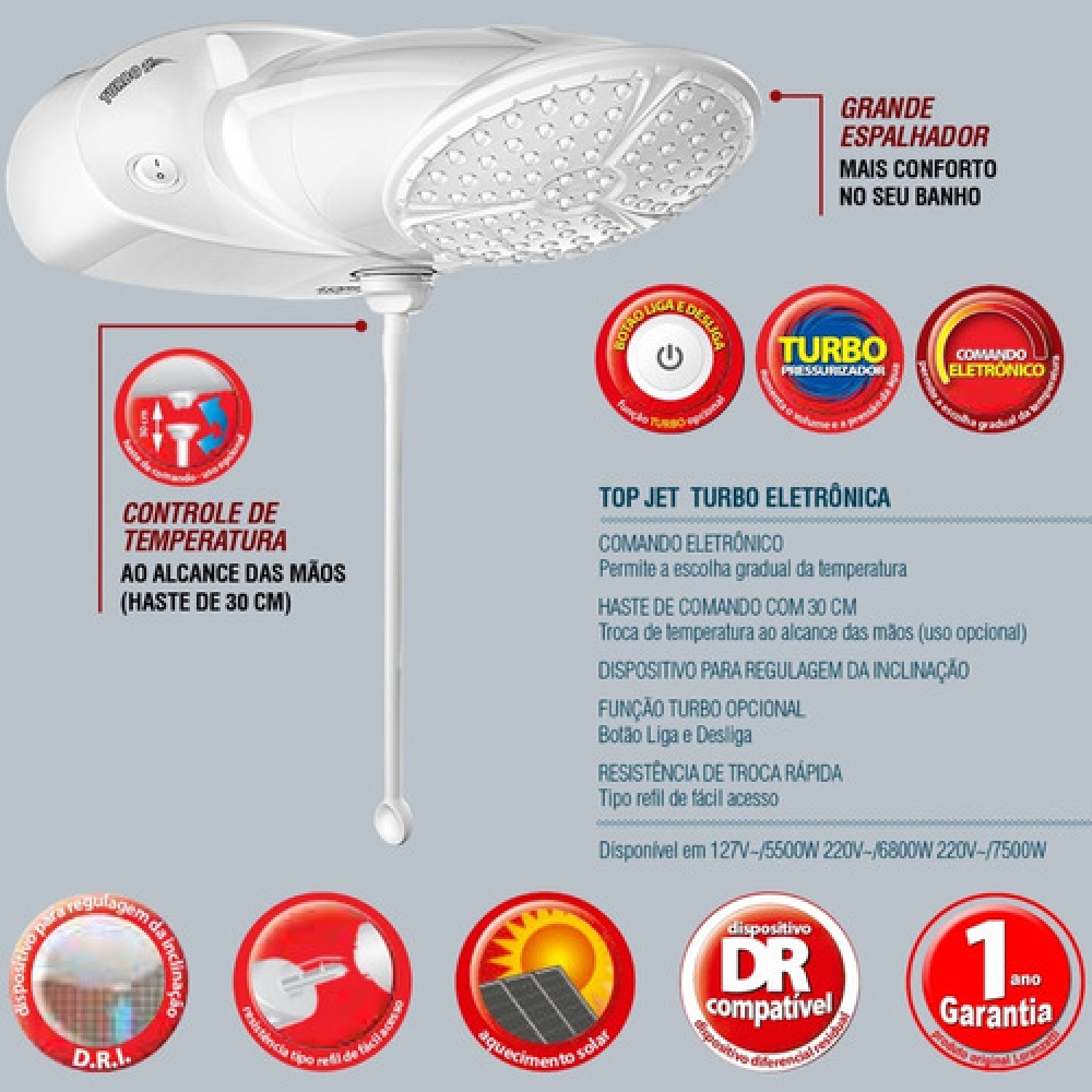 Marca: Lorenzetti Tipo do Chuveiro: Elétrico Controle de Temperatura do Chuveiro: Multitemperatura Tensão Elétrica: 127V (110V) Aprovado pelo Inmetro: Sim Potência: 5500 W Quantidade de Temperaturas: 4 Temperaturas Benefícios: A ducha é compatível com aquecedores solares, ampliando assim a sua utilização Acompanha Pressurizador Interno: Não Fixação do Chuveiro: Direto na Parede Disjuntor: 40 A Material: Plástico Tipo de Material: Termoplástico Cor: Branco Tonalidade: Branco Característica Adicional: 60% de economia de energia e água (na posição de potência econômica) Modelo: Top jet Multitemperaturas Altura: 12,1 cm Largura: 16,1 cm Profundidade: 28,4 cm Produto: Chuveiro Proteção Contra Choques: Compatível com Dispositivo DR Produto: Chuveiro Dica: Resistência de troca rápida - tipo refil Garantia do Fabricante: 1 mes(es) Observações sobre a Garantia do Fabricante: 12 meses Peso do Produto: 1 Kg Conteúdo da Embalagem: 1- chuveiro ducha top jet/ 1- mangueira/ 1- ducha manual(chuveirinho)/ 1- manual de instalação/ 1- haste de comando