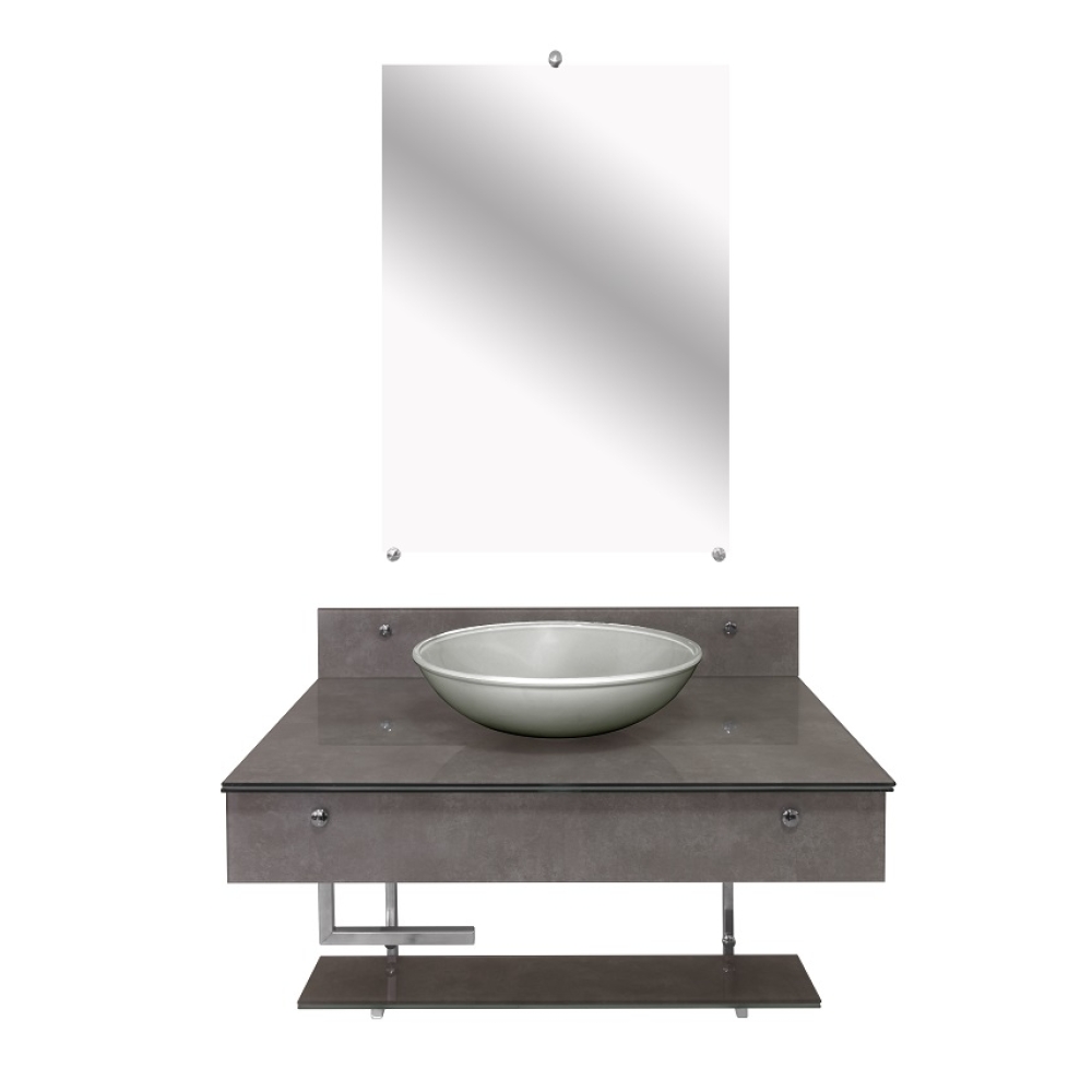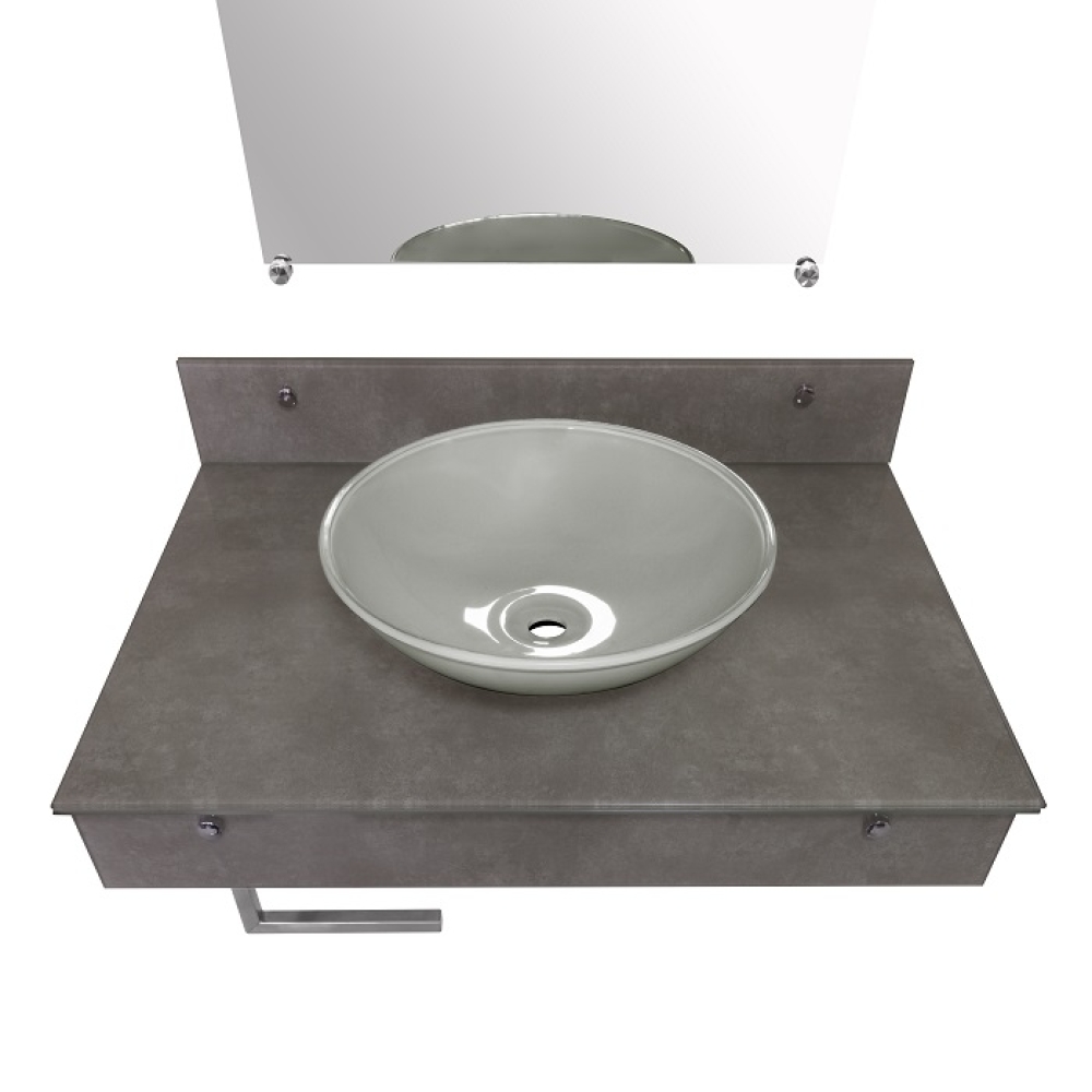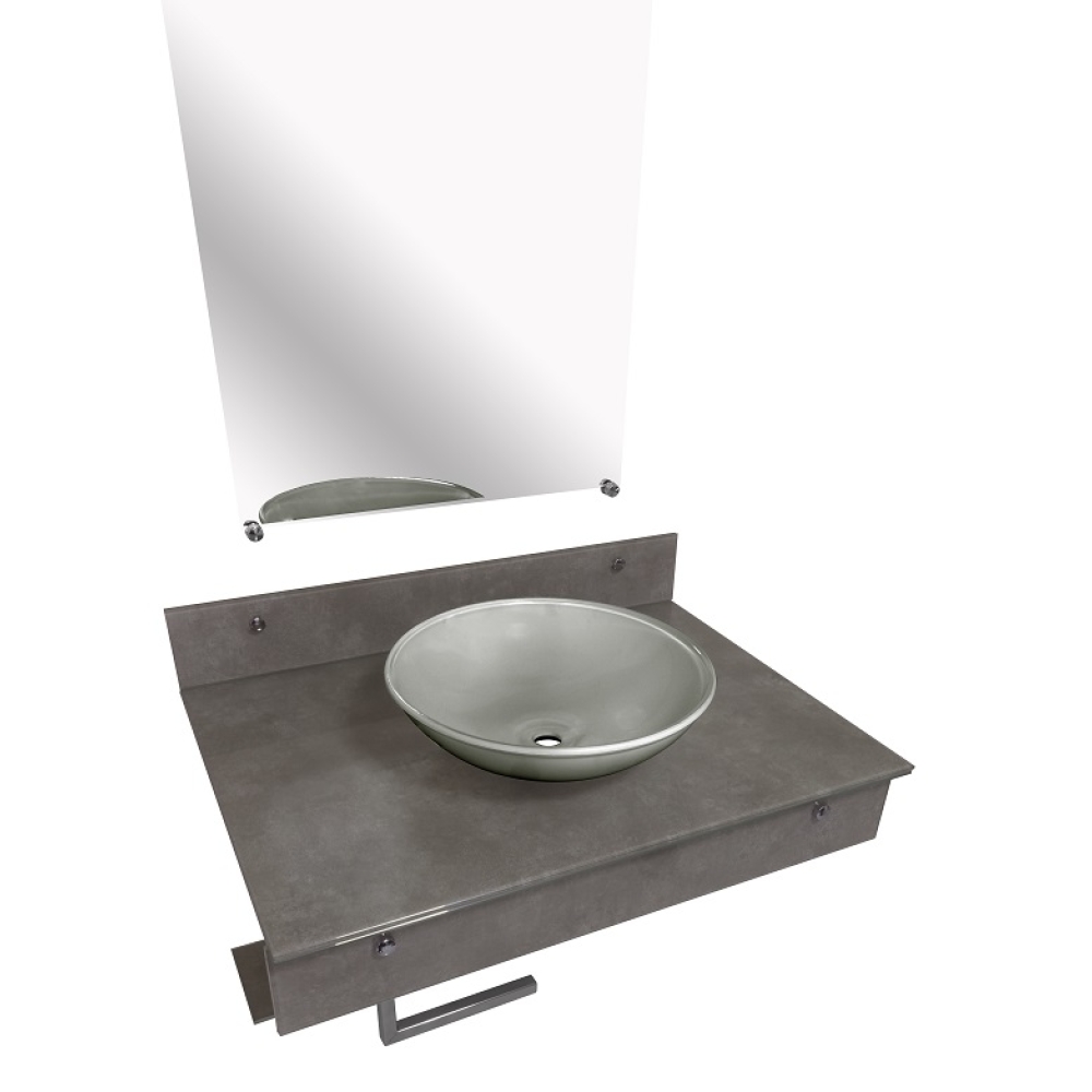 Bancada em vidro 10mm, cuba na cor escolhida, espelho, mão francesa em inox 304, prateleira e toalheiro.