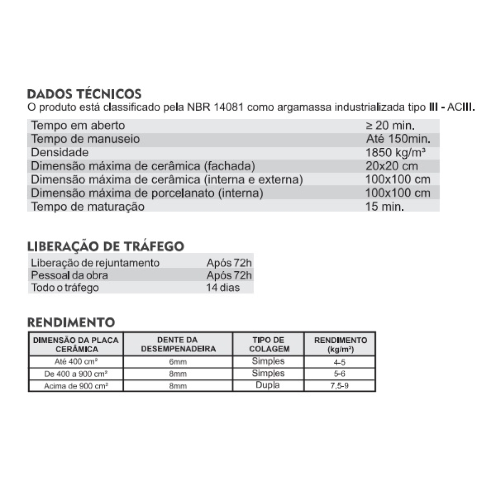 Características e Benefícios • As peças cerâmicas a serem aplicadas devem estar secas, limpas, sem poeiras, películas ou resíduos que impeçam a aderência da argamassa. • Observar a necessidade de juntas de movimentação. • Cordões de argamassa ressecados deverão ser removidos e não poderão ser reutilizados, pois a reação química já se iniciou perdendo as propriedades de aderência. • Somente após 72 horas da aplicação o pessoal da obra poderá transitar sobre o piso. • Consulte a embalagem, ou ficha técnica para maiores informações. • Use sempre equipamentos de segurança e proteção individual.