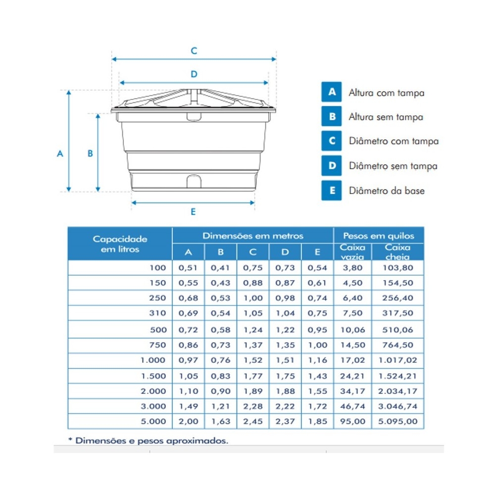 Uso Indicado: Residências, instalações comerciais, sítios, escolas e ambientes que necessite de água em temperatura ambiente. Tipo da Tampa: Simples Produto: Caixa d'água/Caixa d'agua Material: Plástico Tipo de Material: Polietileno Tonalidade: Azul Tamanho: Médio Capacidade: 1000 L Formato: Redondo Altura com Tampa: 0,97 m Altura sem Tampa: 0,76 m Diâmetro com a Tampa: 1,52 m Diâmetro sem a Tampa: 1,51 m Diâmetro da Base: 1,16 m Diâmetro da Tampa: 1,52 m Peso do Produto: 16,7 Kg Referência do Produto: 2010007 Marca: Fortlev Garantia do Fabricante: 60 mes(es)