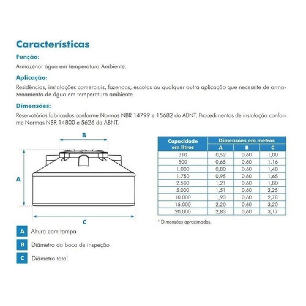 Uso Indicado: Residências, instalações comerciais, sítios, escolas e ambientes que necessite de água em temperatura ambiente. Tipo da Tampa: Click Produto: Tanque Material: Plástico Tipo de Material: Polietileno Cor: Azul Tamanho: Médio Capacidade: 5000 L Formato: Redondo Altura com Tampa: 1,51 m Altura sem Tampa: 1,51 m Diâmetro com a Tampa: 2,25 m Diâmetro sem a Tampa: 2,25 m Diâmetro da Base: 2,25 m Diâmetro da Tampa: 0,60 m Acessórios que Acompanham: Dois adaptadores e flanges instalados. Peso do Produto: 81,5 Kg Referência do Produto: 2070025 Marca: Fortlev Garantia do Fabricante: 60 mes(es)