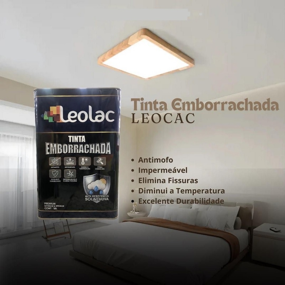 A tinta LEOLAC EMBORRACHADA é a solução completa para pintar e proteger paredes internas e externas, pois forma uma película emborrachada flexível que previne fissuras e infiltrações, combate o mofo e bolor, além de conferir máxima durabilidade e resistência. Foi desenvolvido para ser aplicado diretamente em paredes novas ou rebocos, pois bloqueia o aparecimento do salitre.