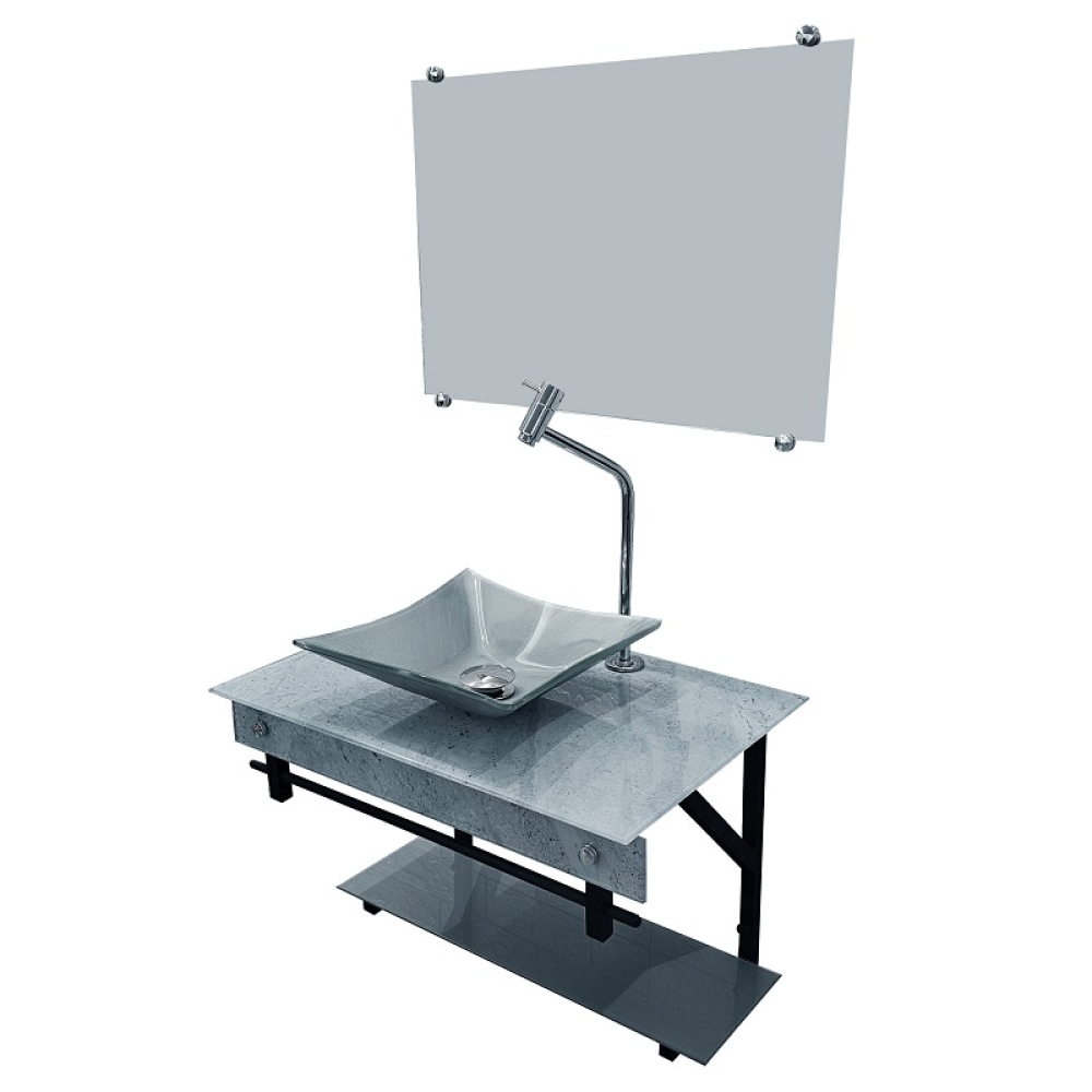 Referência: S60CQ PPQ-T Cuba de Apoio: Quadrada 31 cm Válvula: Click PP/Inox Estrutura: PPQ-T (com testeira) Espelho: Incolor 60x40 cm Tamanho: 60x40 cm