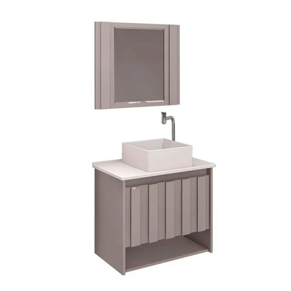 O armário kit Treviso possui composição harmoniosa entre espelheiro e armário, com design estilo ripado que o deixa mais moderno e bonito além de prático, com sua gaveta interna que facilita na organização dos objetos, nicho inferior com ótimo espaço interno e porta de bascular com pistão a gás para uma abertura suave. Sua estrutura é 100% em MDP – BP amadeirado ou texturizado, e possui várias opções de tampo e cuba de sobrepor se adequando a todos os tipos de ambientes, e ao gosto do cliente.