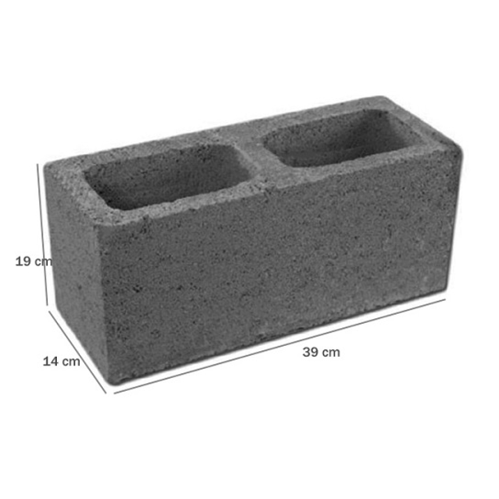 Produto: Bloco de Concreto Tipo: Vedação Tipo de Bloco: Vedação Altura: 19 cm Largura: 14 cm Comprimento: 39 cm Dimensão : 19x14x39 cm Material: Concreto