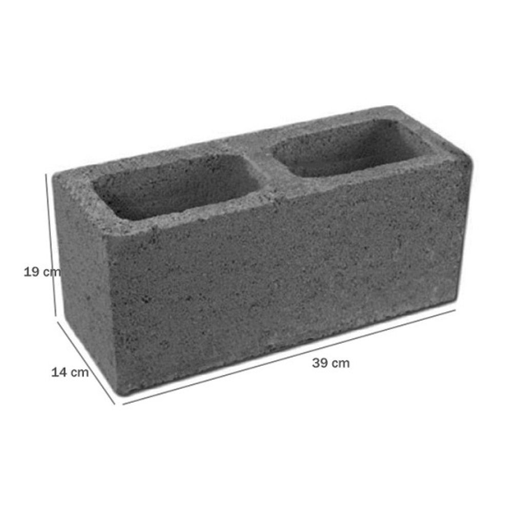 Produto: Bloco de Concreto Tipo: Vedação Tipo de Bloco: Vedação Altura: 19 cm Largura: 14 cm Comprimento: 39 cm Dimensão : 19x14x39 cm Material: Concreto Quantidade de Furos: 2 furo(s)