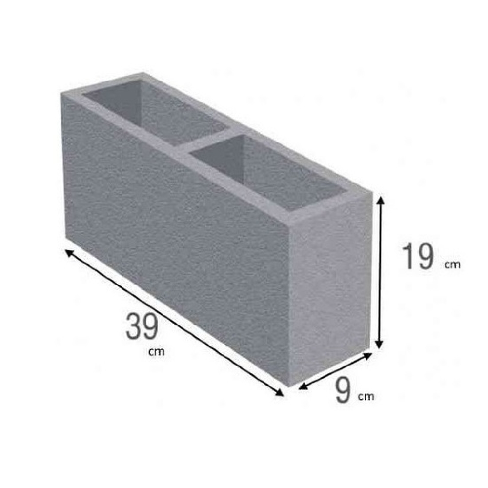 Produto: Bloco de Concreto Tipo: Vedação Tipo de Bloco: Vedação Altura: 19 cm Largura: 9 cm Comprimento: 39 cm Dimensão : 19x9x39 cm Material: Concreto Quantidade de Furos: 2 furo(s)